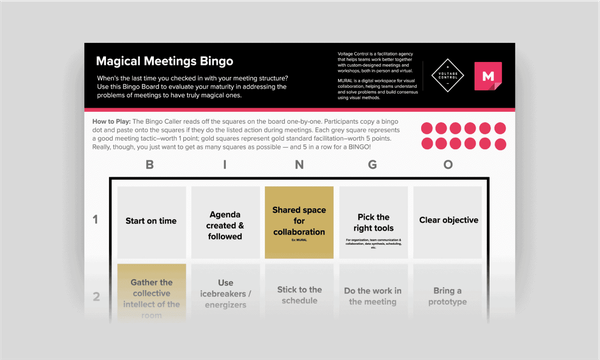 21st May 2020 Magical Meetings Bingo Mural Created a co-branded mural template to help teams assess their internal meeting structure for the Voltage Control x MURAL Magical Meetings Series.